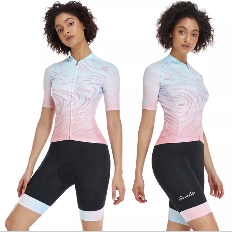 Áo đạp xe ngắn tay dành cho nữ Santic👉Chất liệu - 90% Polyester và 10% Elastane, áo jersey đạp xe cho nữ có độ đàn hồi cao, hút ẩm, thoáng khí và nhanh khô.👉Thiết kế dáng áo 3D - May theo chuyển động của cơ thể có thể làm giảm sức cản của gió và nâng cao hiệu quả đạp xe. 👉Tay áo phối raglan mang lại trải nghiệm thoải mái hơn cho người đi xe đạp.👉Viền áo chống trượt giữ cho đường áo ở đúng vị trí khi đi xe.👉Thiết kế phản quang giúp an toàn hơn khi đạp xe trong tối.👉 Áo jersey đạp xe nữ tay ngắn có 3 túi sau cộng với lớp lót trong có thể tránh đường chỉ cạ vào da của bạn, bỏ được nhiều vật dụng cần thiết.👉Có 2 màu : hồng nhạt và tím hồng--------------------------------------------Quần đùi đạp xe dành cho nữ SANTIC có đệm mông☘️ Chất liệu : 80% Nylon và 20% Spandex, thoải mái, thoáng khí và nhanh khô. Ngoài ra, 20% spandex giúp co dãn tốt, và tôn dáng cơ thể.☘️ Thiết kế bo đùi chống trượt, tránh bị tuột khi đang đạp xe ôm chân.☘️ Màu gradient ở bo đùi làm cho chiếc quần trở nên đẹp mắt và hài hòa hơn.☘️ Đêm mông 4D giúp giảm áp lực lên mông, hiệu quả cho việc đạp xe của bạn. Đệm của chiếc quần đùi này có thể đi trong khoảng 2-3 giờ đạp xe liên tục.☘️ Logo phản quang giúp an toàn hơn đạp tối.
